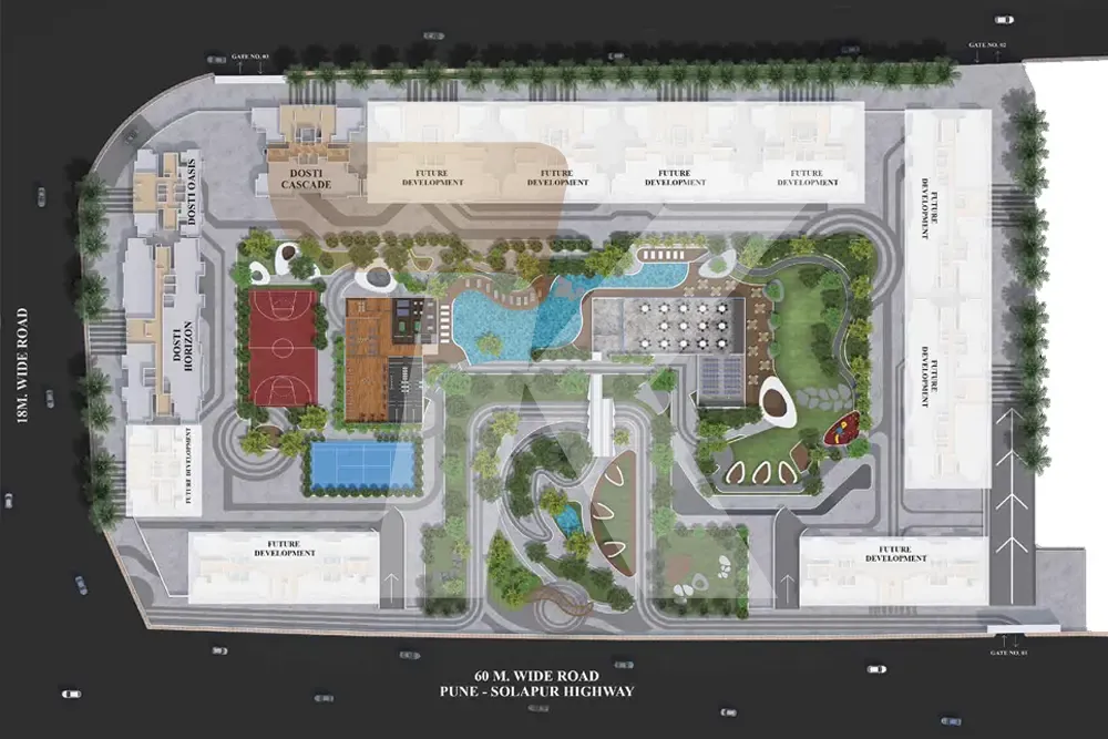 Dosti Greenscapes is strategically located at the intersection of Magarpatta City and OMR, ensuring easy access to key landmarks like the airport, railway stations, and national highways. The community is also close to top educational institutions, healthcare facilities, and major IT hubs, offering an ideal blend of work-life balance. Designed by the renowned Hafeez Contractor, this gated township features home automation, expansive clubhouses, a tennis court, lap pool, and a variety of recreational spaces. Experience a lifestyle that blends urban connectivity with tranquility at Dosti Greenscapes.
